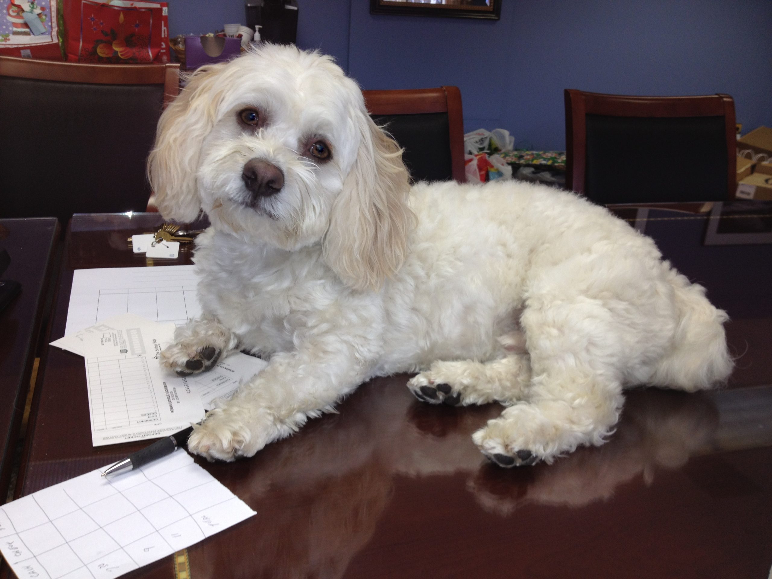 I spent hours teaching him how to do “his business” outside and not inside. I taught him to sit, come, turn around, dance, go under, and play catch. I introduced him to the outside world to hear the different sounds, to sniff new places, and to develop friendships with a variety of dogs. He loved dogs bigger than himself. He was fascinated with cats and babies. He got to know the community. Parishioners would come and pet him on the table in the foyer. That would mean hundreds would come up to him, and he would quietly lie on the table. Caleb would be at daily Mass lying by the Altar and would sit on a chair in the chapel as I spent time in prayer. He loved being in the presence of the Lord. Over the years, Caleb attended many funerals, weddings, and baptisms, and occasionally he visited the school to see the children in the classrooms. When it was time for 1st Communion, Caleb was always ready in his white furry suit. Caleb had a special mission here on earth—not only to put a smile on people’s faces, but also to comfort the dying. At times, I would bring him on Communion calls for those who were nearing death. He would lie on the bed with the dying person to comfort them. He also attended wakes with me. I would say to him, “Go and pray,” and he would go to the kneeler in front of the casket, lift himself up to look at the body, and say his doggie prayer. Caleb was a Havanese, a Cuban dog (Havana), and that breed does not like to be alone. They are smart, friendly, and stubborn. As a priest, I often had to be away doing my priestly work—officiating at funerals, baptisms, and weddings, as well as attending parish meetings and school activities. During those times, my rectory staff watched over Caleb, although one person truly became his mother: Jennifer. She was his constant companion. A few years back, I transitioned Caleb from a conventional veterinarian to Dr. Martha Lindsay, an alternative veterinarian. Caleb also had two other special people, Susan and Fran, parishioners who helped with his medical issues.
